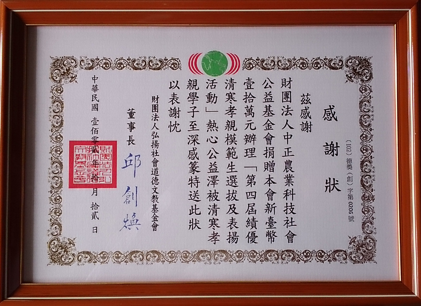 第四屆績優清寒孝親模範生表揚大會發佈日期:2013/10/30 實施期間起迄 102年10月30日 執行單位 財團法人弘揚社會道德文教基金會 執行成果 本基金會支持財團法人弘揚社會道德文教基金會辦理「第四屆績優清寒孝親模範生表揚大會」。 成果照片 第四屆績優清寒孝親模範生表揚大會感謝狀 第四屆績優清寒孝親模範生表揚大會1 第四屆績優清寒孝親模範生表揚大會2 第四屆績優清寒孝親模範生表揚大會3 第四屆績優清寒孝親模範生表揚大會4 第四屆績優清寒孝親模範生表揚大會5